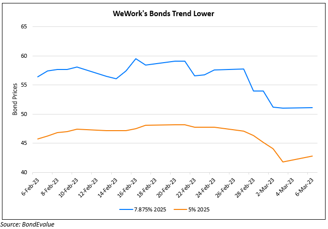 WeWork’s bonds were higher by over 4 points after it reported a first quarter negative EPS of $0.34 vs. estimates of a negative EPS of $0.35. It reported a net loss of $299mn, a $205mn improvement YoY. Revenue for the quarter came in at $849mn, in-line with estimates and improving 11% YoY. It reported a negative free cash flow of $343mn, $18mn better than its projection of a negative FCF of $361mn during the quarter. Its physical occupancy in the quarter also improved to 73%, an increase from 67% at the end 1Q 2022. Sandeep Mathrani, the CEO said, “Following our debt restructuring, we now have a strengthened balance sheet and liquidity position that gives us the runway to deliver against our plan… debt restructuring was backed by a large majority of bondholders and investors, demonstrating their conviction in the WeWork business model and our future”.