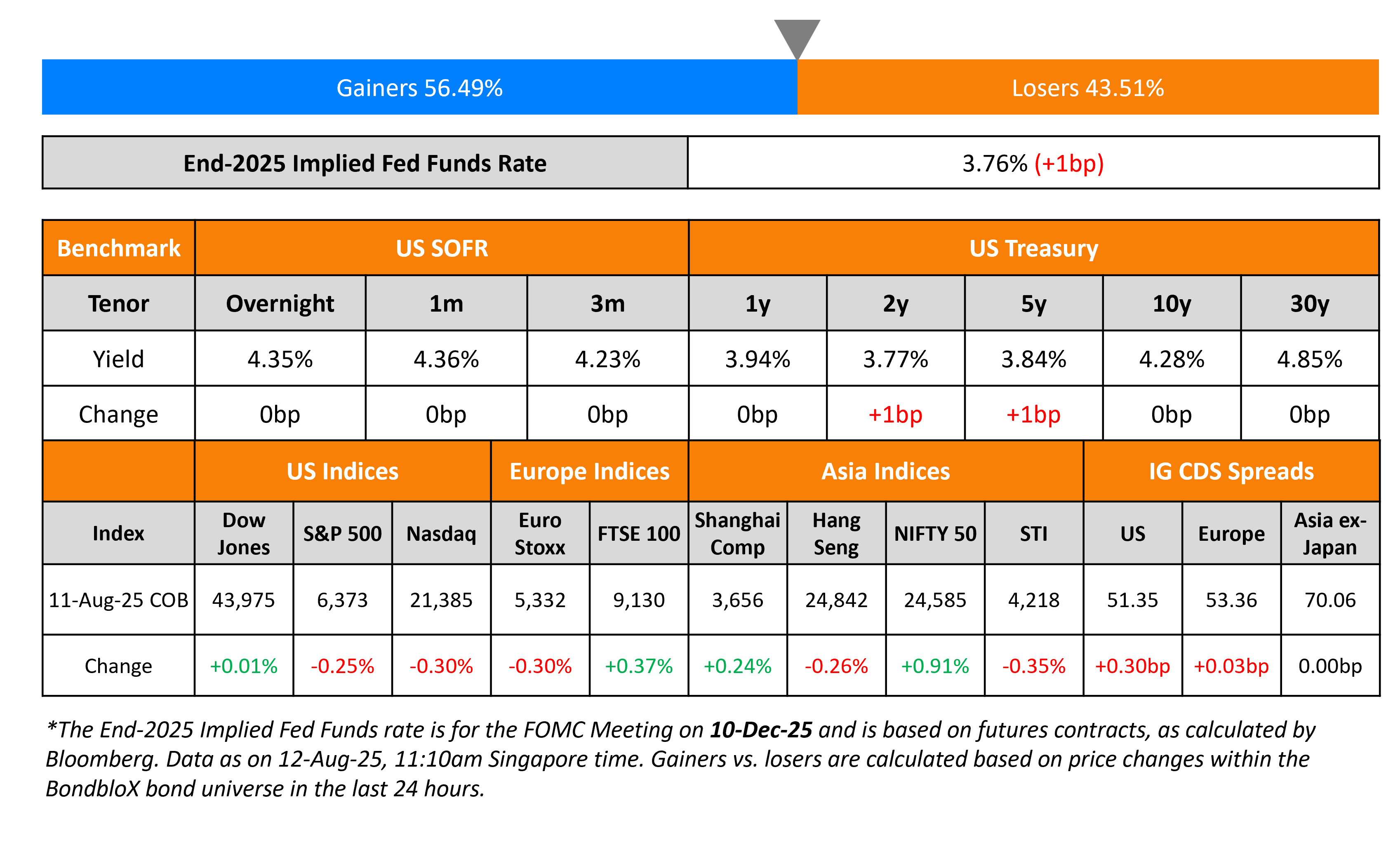 US Treasury yields were broadly unchanged on Monday with markets awaiting the Headline and Core CPI readings later today. Separately, US President Donald Trump signed an executive order to extend the tariff truce with China until November 10. The order extends the existing 30% tariffs on Chinese goods, with Chinese duties on US imports remaining at 10%.