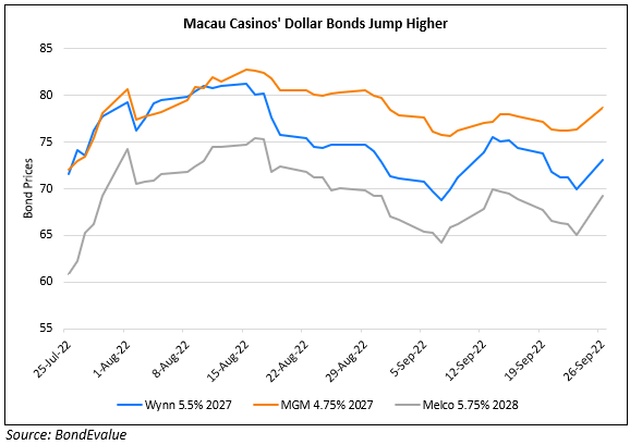 Dollar bonds of Wynn Macau were up 4-7% after it was reported that billionaire Tilman Fertitta acquired a 6.1% stake in the company, making him the second largest individual investor. As per Bloomberg, Fertitta is known to have a deep understanding of the gambling and hospitality industries and his stake is said to bode well for the company which has seen its revenues hit by China’s Covid restrictions.