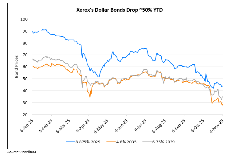 Xerox was downgraded by a notch to CCC+ from B- by S&P. Its first lien notes, second lien and senior unsecured notes were downgraded by the same measure to B, CCC+ and CCC respectively. The downgrade follows Xerox’s second downward revision of its 2025 guidance — this reflects steep revenue declines of 7–8%, a lower EBITDA margin of ~8%, leading to negative core free operating cash flow (FOCF) of $170–200mn. Besides, it also could lead to a higher leverage above 7.5x debt-to-EBITDA. S&P noted that despite Lexmark-related cost synergies and reduced dividends, its weak operating performance, higher tariff-related costs, and reduced receivables after 2026 heighten refinancing risks for its 2028–2029 debt maturities. While the company retains adequate liquidity to meet near-term debt servicing needs, S&P views Xerox’s path to restoring organic revenue growth and positive cash generation as uncertain. More broadly, S&P highlighted elevated global uncertainty tied to US policy direction, tariffs, and geopolitical tensions, which continue to weigh on Xerox’s credit conditions and economic forecasts.