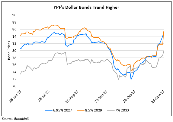 YPF’s dollar bonds have trended higher over the past week and were trading with a positive bias – its 7% 2033s were up 0.5 points to 98.5, cents on the dollar, yielding 7.23%.