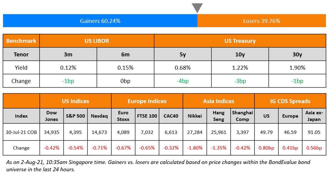 US Q2 GDP accelerated 6.5% on an annualized basis against an estimate of 8.4%. Eurostat Euro-area GDP grew by 2% in Q2 vs. a decline of 0.3% in Q1. The CPI in July came in at 2.2% vs. 1.9% last year and against a forecast of 2% and unemployment rate was at 7.7%. US IG CDS were 0.8bp wider and HY spreads widened 5.7bp. EU Main and Crossover spreads widened 0.4bp and 3.5bp respectively. Asia ex-Japan CDS spreads were 0.6bp wider.
