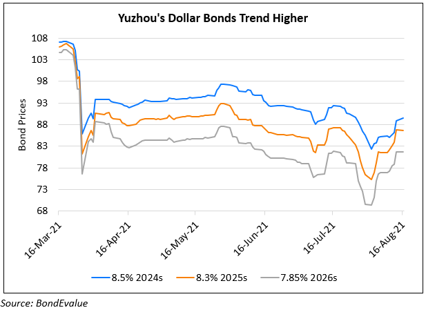 Yuzhou Group said on Friday that had it repurchased $2mn of its outstanding 8.3% 2025s and $1mn of its outstanding 7.375% 2026s. After the buyback, the outstanding principal of the 2025s and 2026s stands at $486mn and $636.5mn respectively. While the size of the buyback was relatively small, the news sparked a 2-4% rally in its dollar bonds on Friday with its 7.85% 2026s leading the gains, up 4% to 81.8 cents on the dollar.
