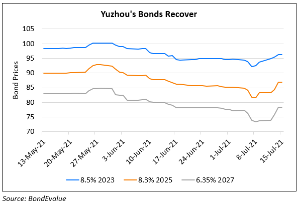Yuzhou Group’s dollar bonds have been trending higher since the firm started buying back its dollar bonds a week earlier. Yuzhou’s bonds had been moving lower since the beginning of June with concerns on Evergrande spilling over to peers. Prior to that in March, Yuzhou warned of weaker earnings that led to a Moody’s downgrade to B1 from Ba3. A week later it reported a 97% drop in 2020 net profits and a subsequent downgrade by Fitch to B+. At the time, BOC International said Yuzhou’s poor result should be a “one-off earnings shock” and that prices reflected all the near-term negatives.