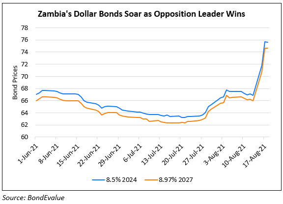 Zambia’s dollar bonds rallied on Monday after opposition leader Hichilema beat the incumbent President Edgar Lungu by a strong margin of ~1mn votes during the Zambian Presidential elections. The new president elect is widely expected to spur economic growth and has pledged to accelerate talks with the IMF to secure funding required to reduce the nation’s “unsustainable debt level” as per Bloomberg. The landslide victory will also allow easier policy changes. Aleix Monatana, Africa analyst at risk intelligence company Verisk Maplecroft said, “Hichilema’s first priority as president will be to implement economic reforms and to work towards an agreement with the IMF for financial assistance, which has become more likely following his victory,” while adding “An IMF bailout would facilitate the restructuring of Zambia’s debt.” Jian, a portfolio manager at Amundi said, “We do believe the cure of the bond default is one of Hichilema’s priorities, as a more market-based Zambia economy needs the bond market to partially finance its reform and growth program.”
