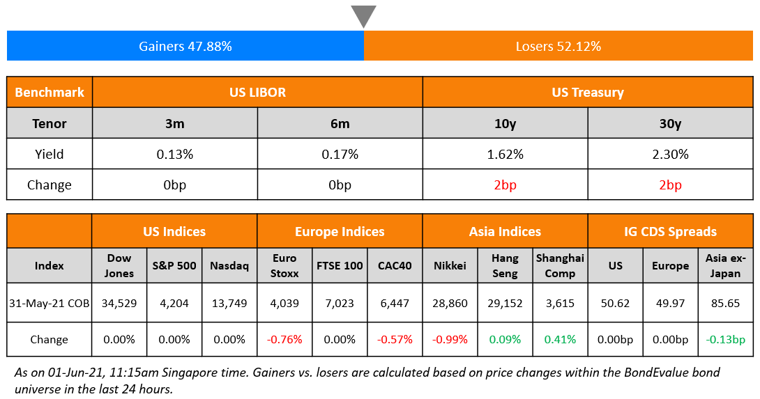 While US and UK markets were shut, the broader European markets fell with DAX down 0.7% and CAC down 0.6%. German inflation shot up to 2.4%, its highest since October 2018 mainly due to a 10% YoY rise in oil and energy prices. OECD raised the growth forecast for the global economy to 5.8% this year and 4.4% next year on vaccine rollouts and the US stimulus. US 10Y Treasury yields were up 3bp to 1.62%. US IG CDS spreads were 0.3bp tighter and HY spreads were 1.4bp tighter. EU main spreads were 0.5bp tighter and crossover spreads tightened 2.9bp. Asian equities had a muted start – Nikkei and Hang Sang were flat while Shanghai was down 0.3%. Meanwhile, Indian markets remained bullish with the Nifty at a record closing high. Asia ex-Japan CDS spreads tightened 0.1bp.